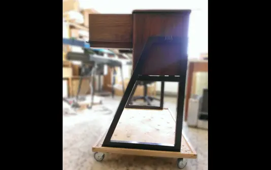 Das rechte Untermanual-Seitenbrett wurde zu Klappe umgebaut, welche die HX3 Bedienelemente verbirgt, sodass der Spieltisch zunächst nicht umgebaut erscheint.